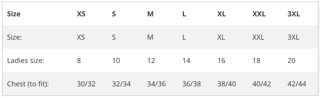 Chest (to fit) 30/32 32/34 34/36 36/38 38/40 40/42 42/44