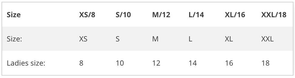 | XS/8 | S/10 | M/12 | L/14 | XL/16 | XXL/18 | |