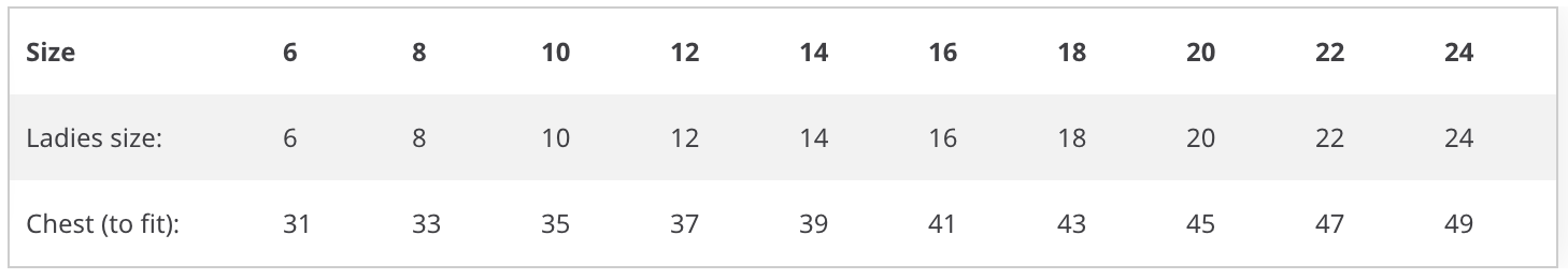 | Chest (to fit) | 31 | 33 | 35 | 37 | 39 | 41 | 43 | 45 | 47 | 49 |
