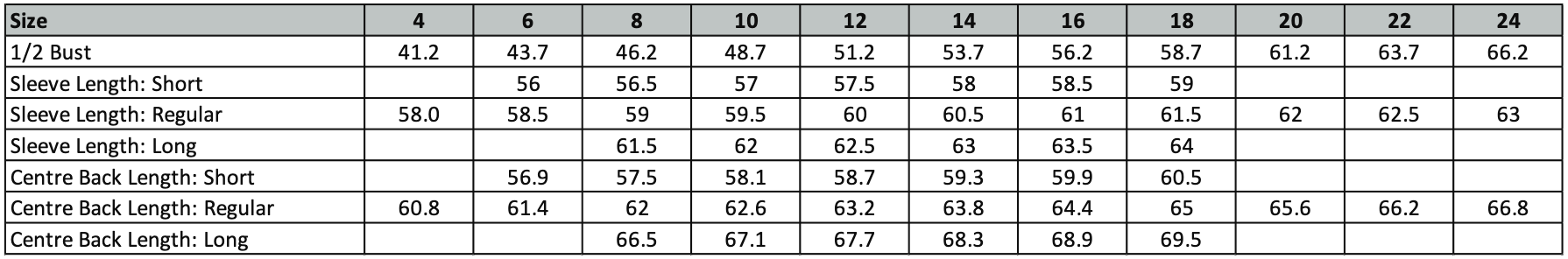 Centre back length at size 12R = 63cm
