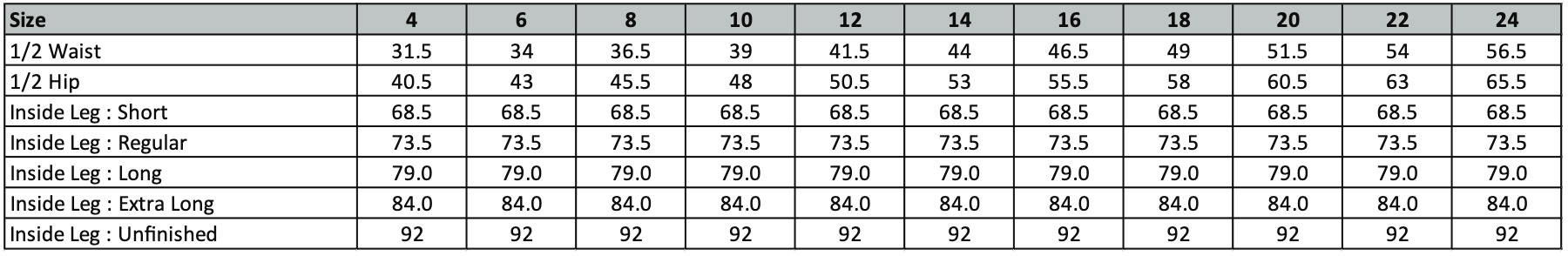 Tailored leg, front hook fastening, 2 side pockets, mock rear pockets, belt loops